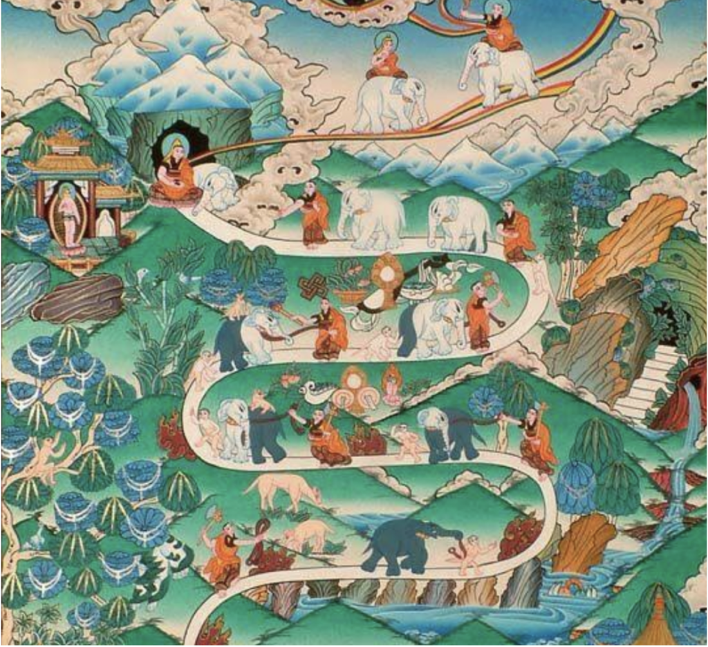 In this workshop we will paint “Nine Stage Meditation Thangka” illustrating the progressive steps of shamatha or calm abiding meditation, with Tibetan traditional Sand Mandala’s tools and colored sand. As we create the image, we will learn about and meditate on each step of the path.